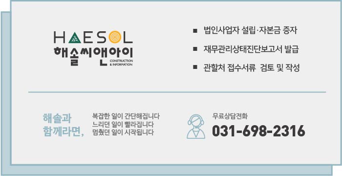 실질자본금의 경우 회사의 설립 시기 및 형태, 겸업사업 여부, 자본금이 필요로 한 별도 면허 보유 유무 등에 따라 준비되는 과정에 차이가 있으므로 실질자본금에 대한 전문 지식을 갖춘 해솔씨앤아이와 같은 건설경영 전문가와 회사의 재무 및 경영상태를 면밀히 파악 후 준비하시는 것을 권장드립니다.