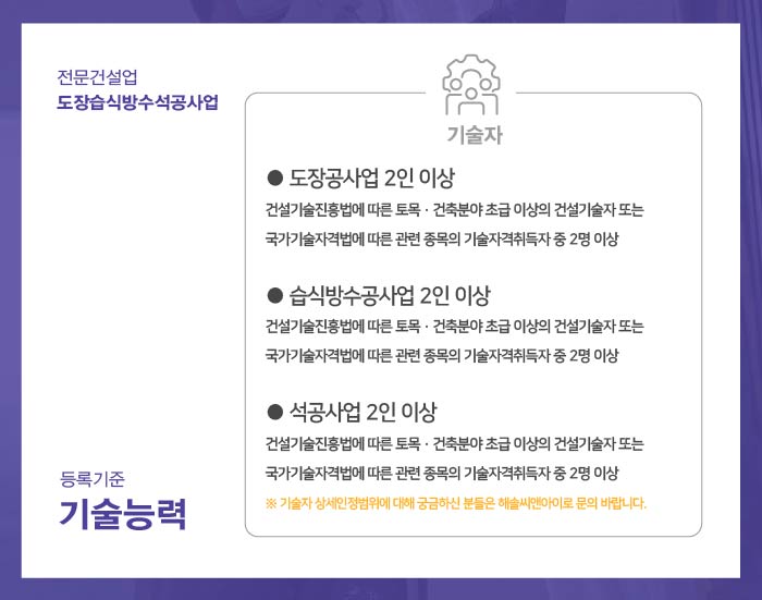 자격요건을 충족하는 기술인력이 준비되어야 도장습식방수석공사업 면허 취득이 가능하게 됩니다.