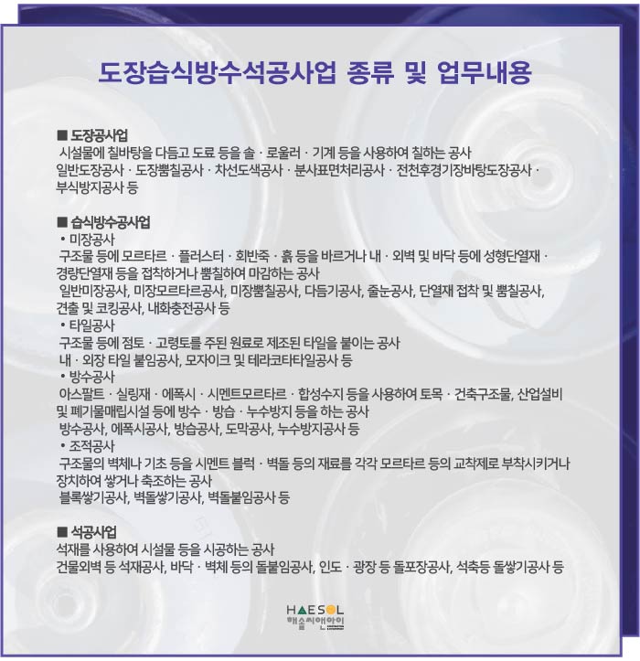 도장습식방수석공사업은 도장공사업, 습식방수공사업, 석공사업 이 3개의 주력분야를 포함하고 있습니다.