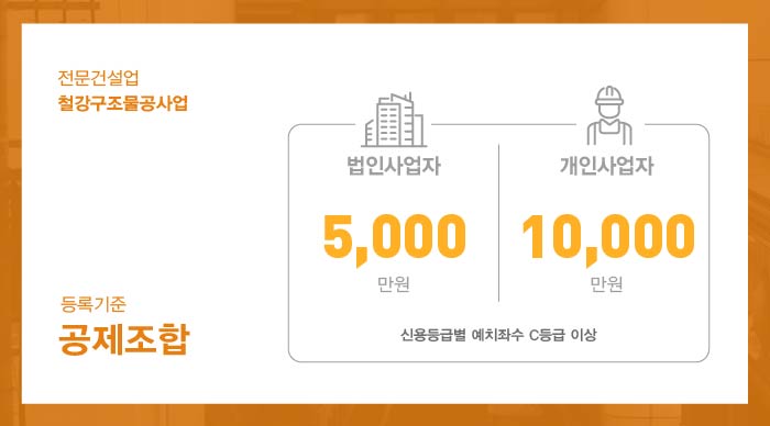 철강구조물공사업 면허 등록을 위해 법인 1억 5천만원 이상, 개인 3억 이상의 자본금이 필요합니다.