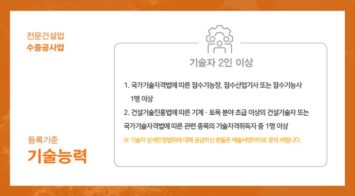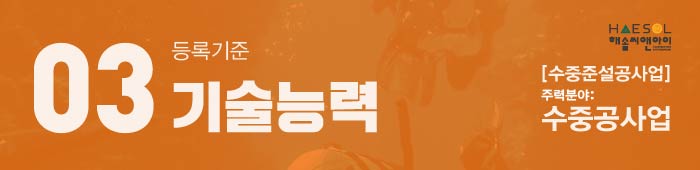 수중공사업 면허 취득을 위한 기술인력 2인 이상이 준비되어야 합니다.