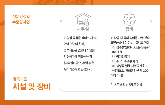 수중공사업 면허 등록 및 사업을 운영하기 위한 사무실과 장비의 준비가 갖추어 져야 합니다.