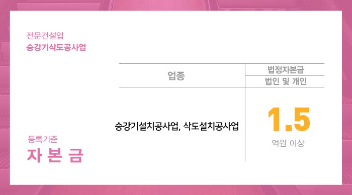 승강기삭도공사업 면허 등록의 진행을 위해서는 법인과 개인사업자 모두 1억 5천만원 이상의 자본금을 준비해야 합니다.