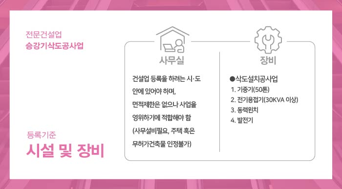 사무실과 장비를 준비해주셔야 승강기삭도공사업 면허 취득을 진행할 수 있습니다.