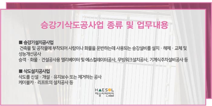 승강기삭도공사업 면허 등록과 관련하여 더 자세한 안내 및 도움이 필요하시다면, 건설면허 전문가 해솔씨앤아이로 문의주세요!