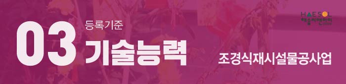 이 기술인력은 한국건설기술인협회에서 발급하는 조경분야 초급 이상의 경력수첩 소지자 또는 관련 국가기술자격증 소지자여야 합니다.
