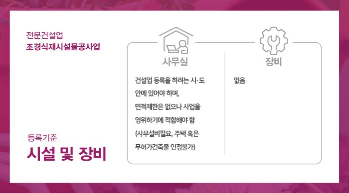 건축물의 용도가 주거용이나 무허가 건축물이 불법건축물인 경우에는 건설업 등록이 불가능하므로, 사무실을 준비할 때 반드시 건축물대장을 통해 용도 확인을 미리해야 합니다.