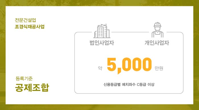 조경식재공사업 면허 취득을 하기 위해서는 법인 및 개인사업자 모두 1억 5천만원 이상의 자본금을 준비해주셔야 합니다.