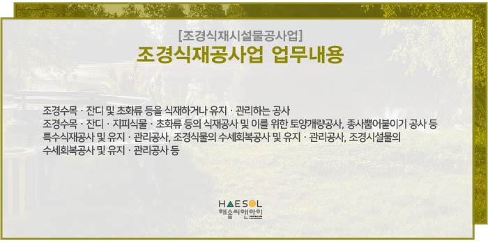 조경식재공사업면허 등록에 대한 더 자세한 내용이 궁금하시거나 등록을 준비하는 과정에 도움이 필요하신 경우에는 건설면허 전문가 해솔씨앤아이로 문의주시기 바랍니다.