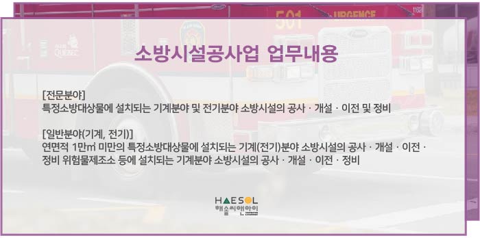 소방시설공사업은 특정 소방대상물에 설치되는 기계분야 및 전기분야의 소방시설의 공사, 개설, 이전 및 정비를 전문으로 하는 사업입니다.