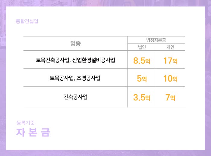 종합건설면허 취득을 위해서는 업종별로 규정된 자본금 이상을 보유해야 합니다.