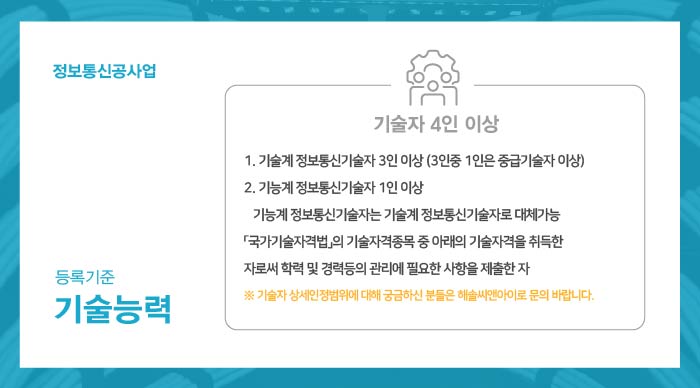 정보통신공사업 기술능력 기준 충족을 위해서는, 규정된 자격을 갖춘 4인 이상의 기술자가 보유가 필요합니다.