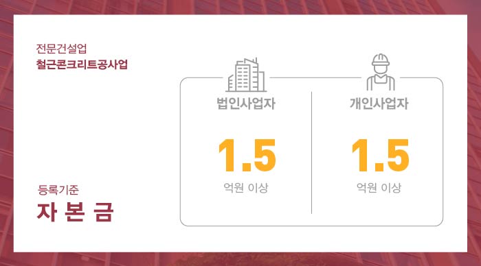 철근콘크리트공사업 면허 취득을 위해서는 법인 및 개인사업자 모두 1.5억 이상의 자본금을 준비해야 합니다.
