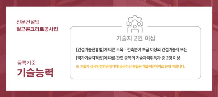 철근콘크리트공사업 면허 등록을 하기 위해 준비 해 주셔야 하는 기술인력은 한국건설기술인협회에서 발급하는 토목, 건축 분야 초급 이상의 경력수첩을 소지하거나 관련 종목의 국가기술자격증을 취득하신 분들로서 구성되어야 합니다.