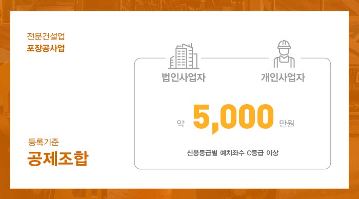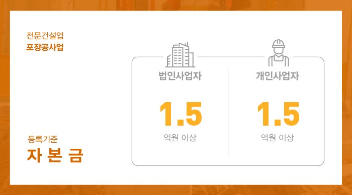 첫번째로 살펴 볼 포장공사업 등록기준은 자본금으로, 법인 및 개인사업자 모두 1억 5천만원의 건설업 실질자본금을 준비해주셔야 합니다.