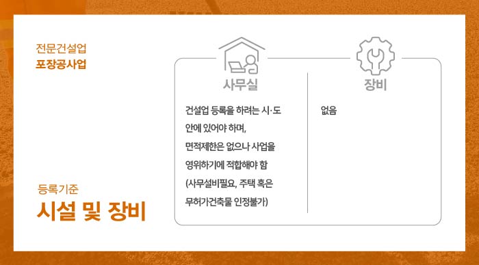 포장공사업은 장비에 대한 필수 기준은 없지만 면허등록을 하기 적격한 사무실의 준비가 필수로 필요합니다.