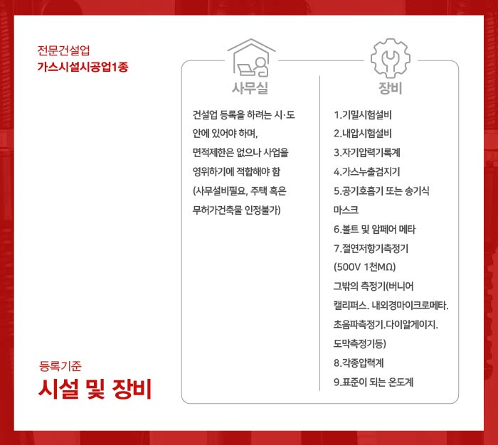 가스시설시공업 1종 면허 등록 및 사업을 운영하기 위한 사무실과 장비의 준비가 갖추어 져야 합니다.