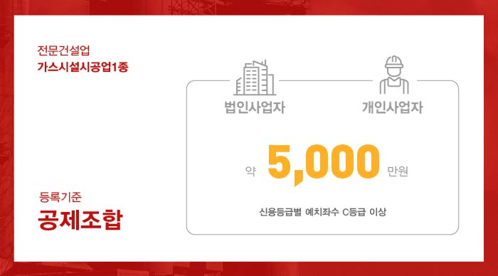 가스시설시공업 1종 면허 취득을 위해서는 법인 및 개인사업자 모두 1.5억 이상의 자본금을 준비해야 합니다.