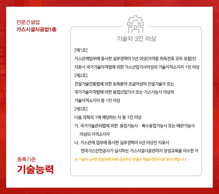 가스시설시공업 (제 1종) 기술능력 기준으로는 다음과 같은 자격 요건을 충족하는 기술자 3인 이상 보유가 필요합니다.