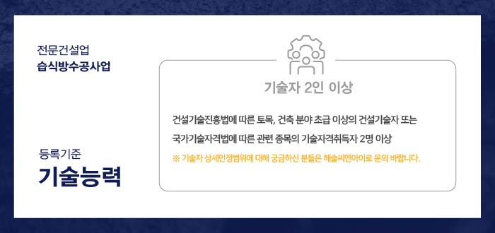 기술자는 한국건설기술인협회에서 발급하는 토목/건축/ 분야 초급 이상의 경력수첩 소지자 또는 국가기술자격법에 따른 관련 종목의 기술자격 취득자로서 2인 이상 구성될 수 있도록 해 주셔야 합니다.