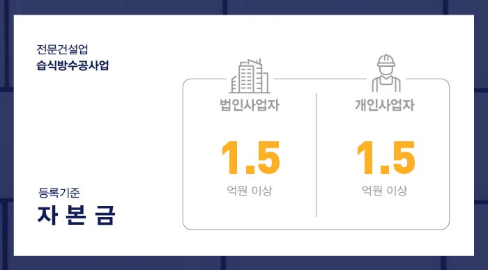 습식방수공사업 면허 등록을 위한 자본금 1억 5천만원 이상의 준비가 필요합니다.