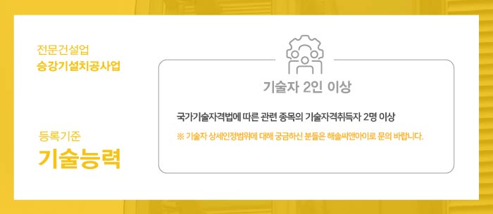 승강기설치공사업면허 취득을 위해서는 다음 요건을 충족하는 기술자 최소 2인 이상이 준비되어야 합니다.