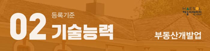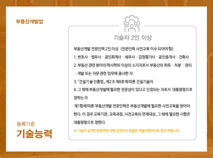 기술자가 갖추어야 할 자격 요건은, 부동산개발 전문인력 2인 이상으로 전문인력 사전교육을 이수해야 합니다.