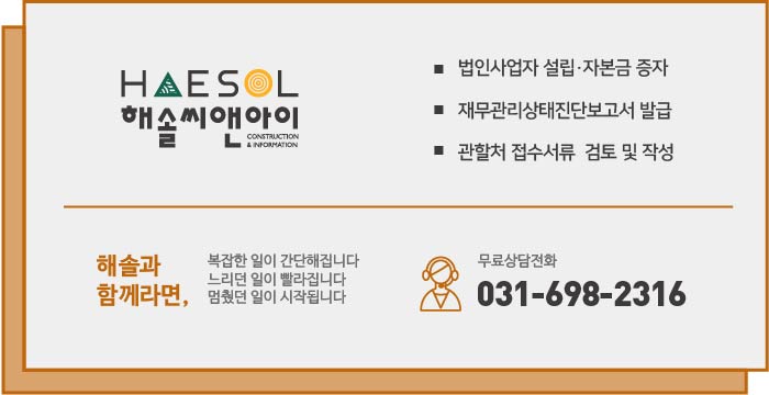 이와 같이 자본금을 입증하기 위한 서류는 회사의 컨디션에 따라 차이가 있으므로 해솔씨앤아이로 문의주시면 더욱 자세한 상담을 통해 안내드리겠습니다.
