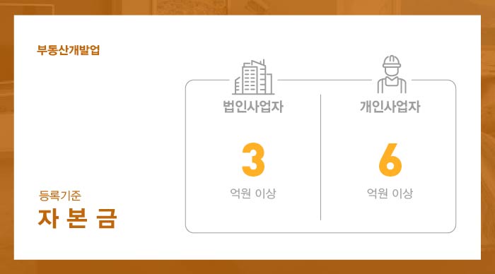 부동산개발업 면허 등록을 위해서는 법인 3억원 이상, 개인사업자는 6억원 이상의 자본금이 준비되어야 합니다.