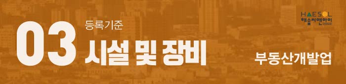 부동산개발업의 경우 별도로 규정된 특수 장비가 없으므로 시설로서 사무실의 요건을 잘 갖추어 준비해주시면 됩니다.