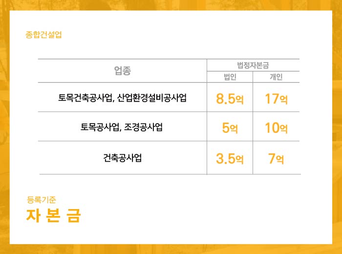 종합건설면허 등록을 위해서는 위와 같이 업종별로 규정되어있는 자본금을 등록기준 이상 충족해주셔야 합니다.