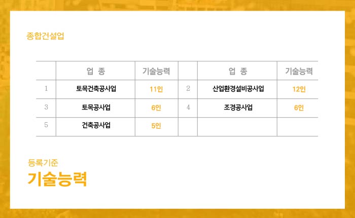 종합건설면허 기술능력 등록기준 충족을 위해서는 업종별로 규정된 자격 요건을 갖춘 기술자를 보유해야 합니다.