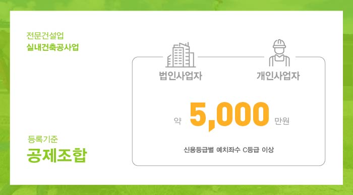 실내건축공사업 면허 등록의 진행을 위해서는 법인과 개인사업자 모두 1억 5천만원 이상의 자본금 준비가 필요합니다.