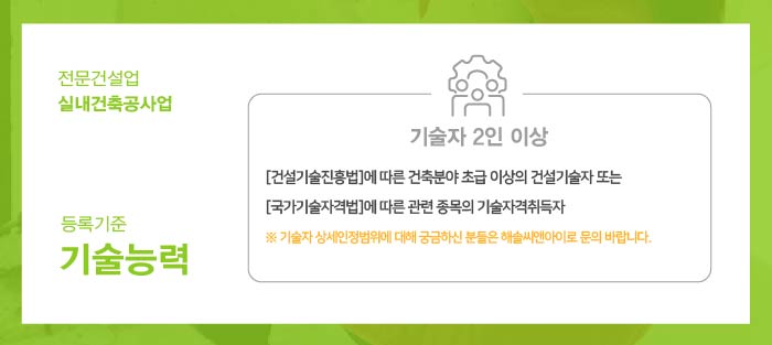 실내건축공사업 실무 운영이 가능한 기술인력 2인 이상이 준비되어야 합니다.