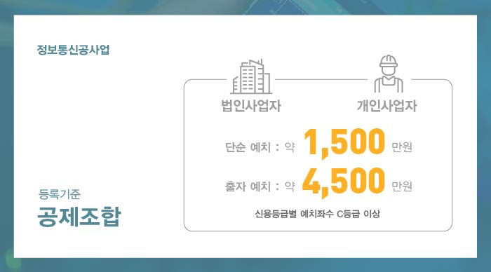 두번째로 정보통신공사업은 면허 신청 전, 미리 정보통신공제조합에 일정 금액의 출자금 예치를 진행하셔야 합니다.