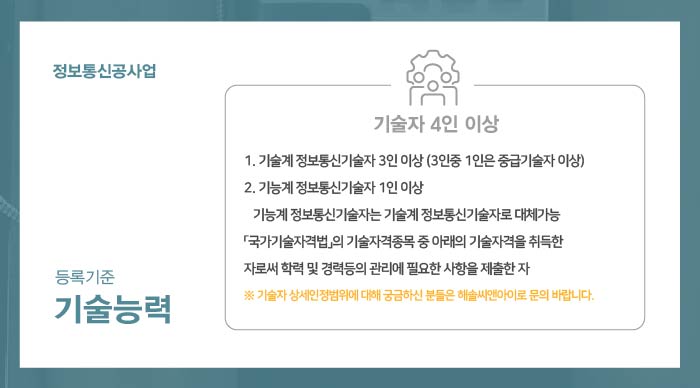 기술자는 기술계 정보통신기술자 3인 이상 (3인 중 1인은 중급기술자 이상)과 기능계 정보통신기술자 1인 이상으로 구성되어야 하며 (기능계 정보통신기술자는 기술계 정보통신기술자로 대체 가능) 모두 면허 등록 예정인 회사에 소속되어 상시 근무가 가능한 임직원으로서 타사 겸업이나 겸직은 불가하며,