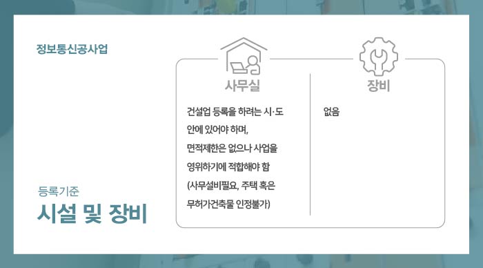 마지막으로 살펴 볼 정보통신공사업 등록기준은 시설 및 장비의 요건입니다.