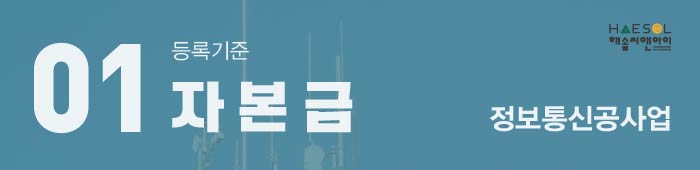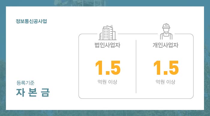 첫번째 살펴 볼 정보통신공사업 등록기준은 자본금으로, 법인 및 개인사업자 모두 1억 5천만원의 건설업 실질자본금을 준비해주셔야 합니다.