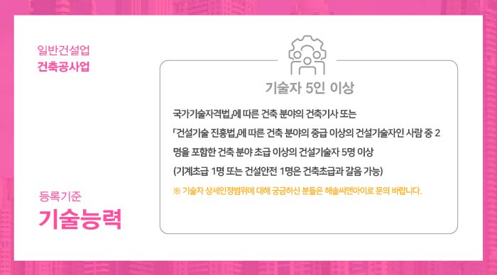 기술능력 기준으로는, 건축공사업에 규정된 자격을 갖춘 기술자 5인 이상을 보유해야 합니다.