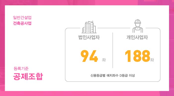 이에 따라 건축공사업은 건설공제조합에 일정 금액을 출자 예치한 후 보증가능금액확인서를 발급받아 면허 신청 시 제출하셔야 하는데, 예치되어야 할 출자 금액은 공제조합 내에서 자체적으로 실시하는 신용평가 결과 등급과 예치 시기에 따라 조금씩 상이하나, 신규로 면허를 등록하는 경우라면 기존에 별도로 평가받을 실적이 존재하지 않기때문에 통상적으로 최대좌수에 해당하는 금액을 예치하게된다고 보시면 됩니다. (법인 94좌, 개인 188좌) '25. 03월 현재 시점 기준 건설공제조합 1좌당 금액은 1,554,000원입니다.