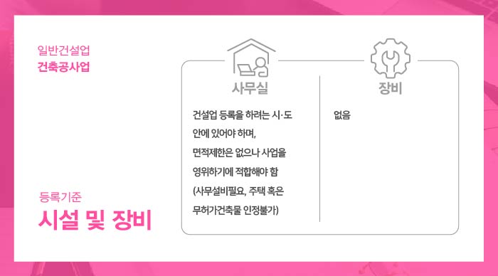 건축물의 용도가 주거용, 무허가건축물, 불법건축물 등의 경우 면허등록이 절대 불가함을 유의해야 하며 지식산업센터나 공장 용도의 경우도 지역 관할처에 별도 문의하여 사무실로써 사용 가능 여부를 명확히 확인받으신 후 준비될 수 있도록 해야합니다.