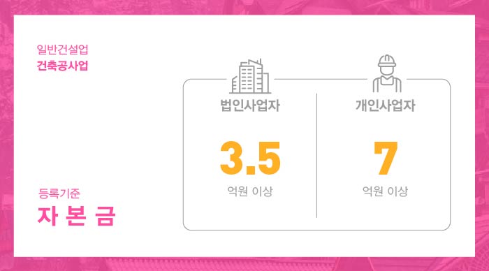 건축공사업 등록을 위해 법인 3억 5천만원 이상, 개인사업자 7억 이상의 자본금을 준비해야 합니다.