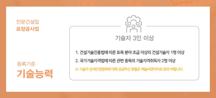 기술인력은 건설기술진흥법에 따른 토목 분야 초급 이상의 건설기술자 1명 이상과 국가기술자격법에 따른 관련 종목의 기술자격취득자 2명이상으로 총 3인 이상이 준비되어야 합니다.
