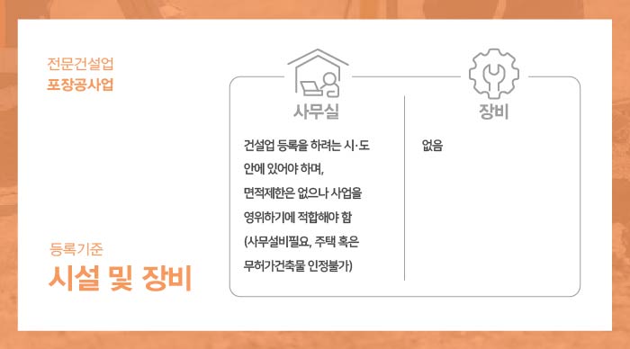 면허 등록을 위해서는 자본금, 공제조합출자, 기술능력, 시설 및 장비의 규정된 요건을 빠짐없이 충족해야하는데