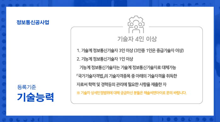 정보통신면허 기술능력 기준 충족을 위해서는, 규정된 자격을 갖춘 4인 이상의 기술자가 보유가 필요합니다.