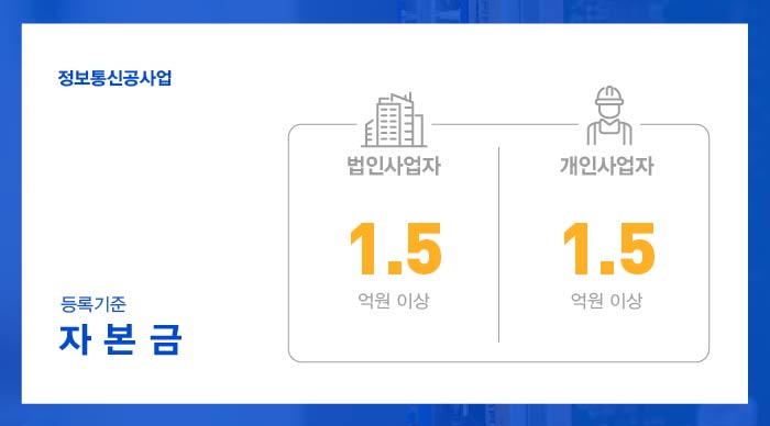 자본금은 건설업 영위를 목적으로 한 건설업 실질자본금으로써 법인 및 개인사업자 모두 1억 5천만원 이상의 자본금을 준비해주셔야 합니다.
