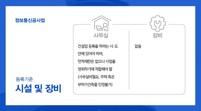 사무실은 면허 등록을 예정하는 시/도 내에 위치해야 하며, 법적으로 면적에 대한 제한은 없지만 업무시설이 갖추어진 곳으로 건축물의 용도가 건설업 등록을 하는데 있어 적격한 곳으로써 준비가 되도록 해야 합니다.