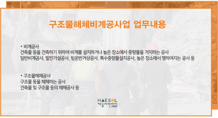구조물해체비계공사업은 기존의 비계구조물해체공사업의 명칭이 변경된 것으로 업무 범위에는 비계공사와 구조물해체공사가 해당됩니다.