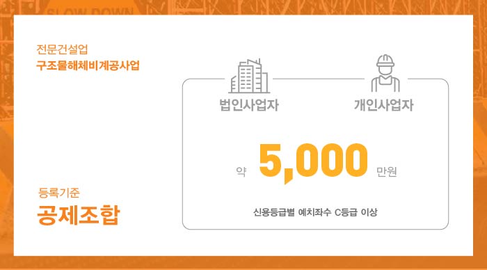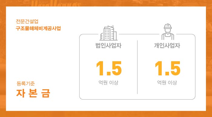 구조물해체비계공사업 면허 취득을 하기 위해서는 법인 및 개인사업자 모두 1억 5천만원 이상의 자본금을 준비 해야 합니다.