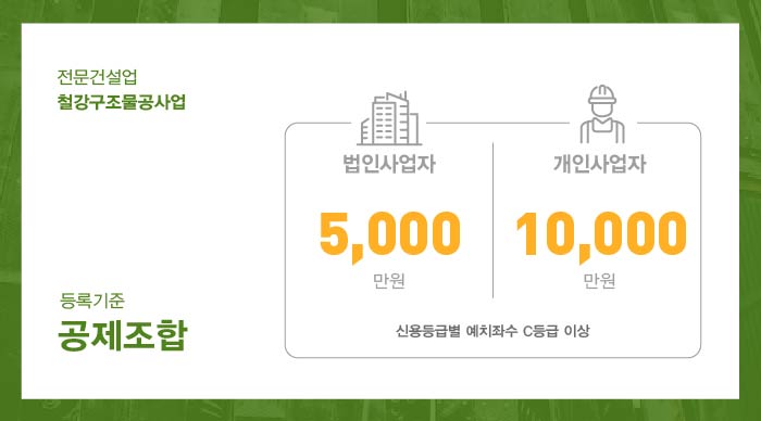 개인사업자 및 법인사업자 모두 준비해야 하는 실질자본금의 기준을 준비해야 하나, 법인사업자는 법인등기부등본상 납입자본금 또한 1억 5천 이상 될 수 있도록 함께 준비해야 하며, 사업목적란에 철강구조물공사업에 관한 목적이 기재될 수 있도록 해야 합니다.
